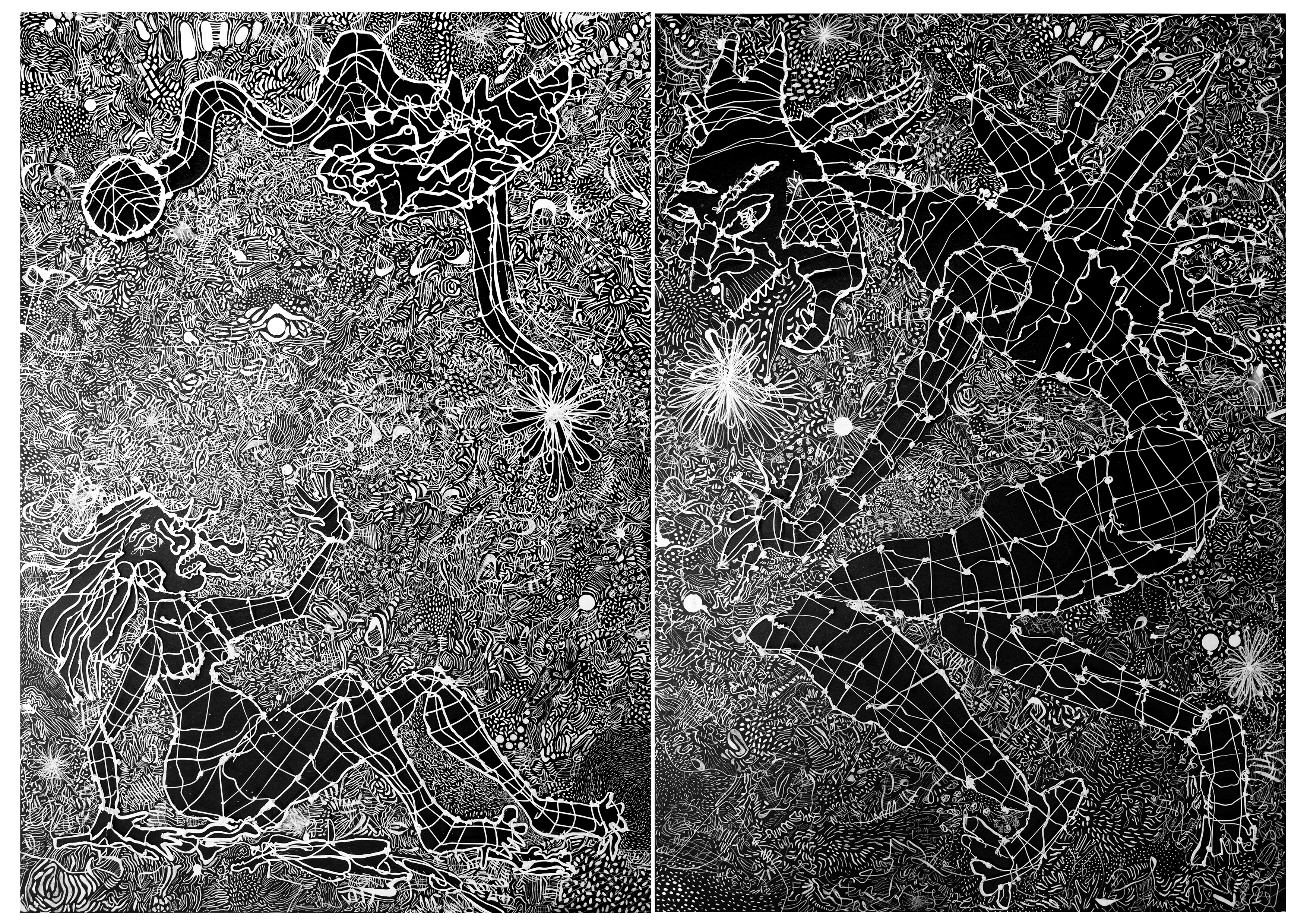 This diptych, created with a 3D pen and acrylic ink on paper was inspired by E.T.A. Hoffmann's short story The Sandman. Through busy patterns and stark contrasts, the artwork recreates the psychological tension of Hoffmann's tale. In the left panel, a figure recoils in terror, while their features distort in response to the presence of fear. Opposite, a shadowy figure looms with distorted limbs and a sinister expression, embodying the relentless and intrusive nature of the Sandman.