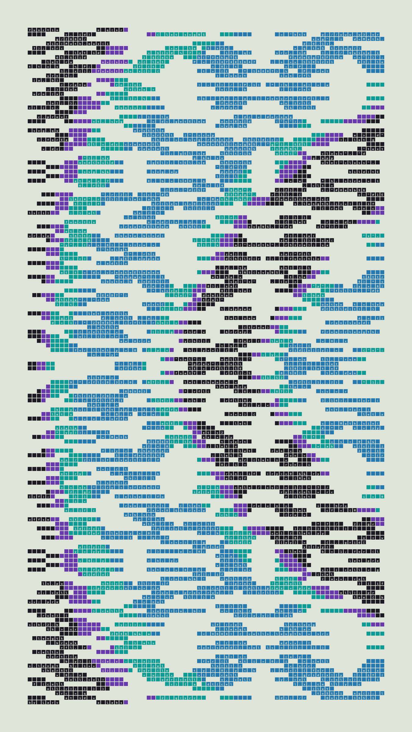 As opposed to creating the artwork directly, the main generator constructs a much smaller, specialized program that produces the visual output, including a layout of its own source code into the work, as well as the mechanism to reproduce itself. In this way, Quines are both program listings and artworks.