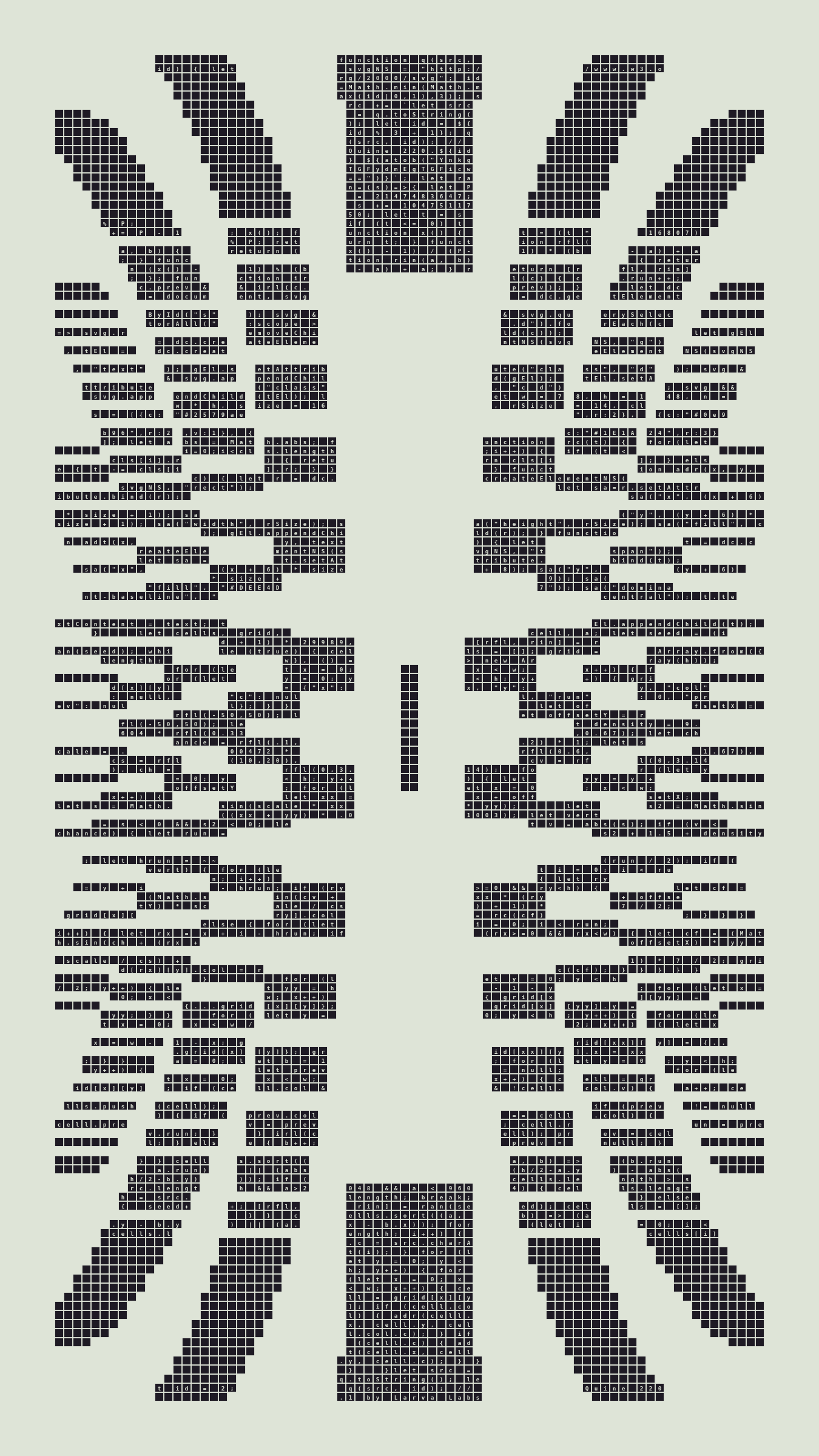 Quine is Larva Labs' contribution to the final Art Blocks Curated series, a project that underscores that all the works on the Art Blocks platform are generated directly from code with no artist supervision. Drawing from the computer science concept of a quine (a computer program that produces a copy of its own source code as its output), the work incorporates its own code into the visuals it creates.