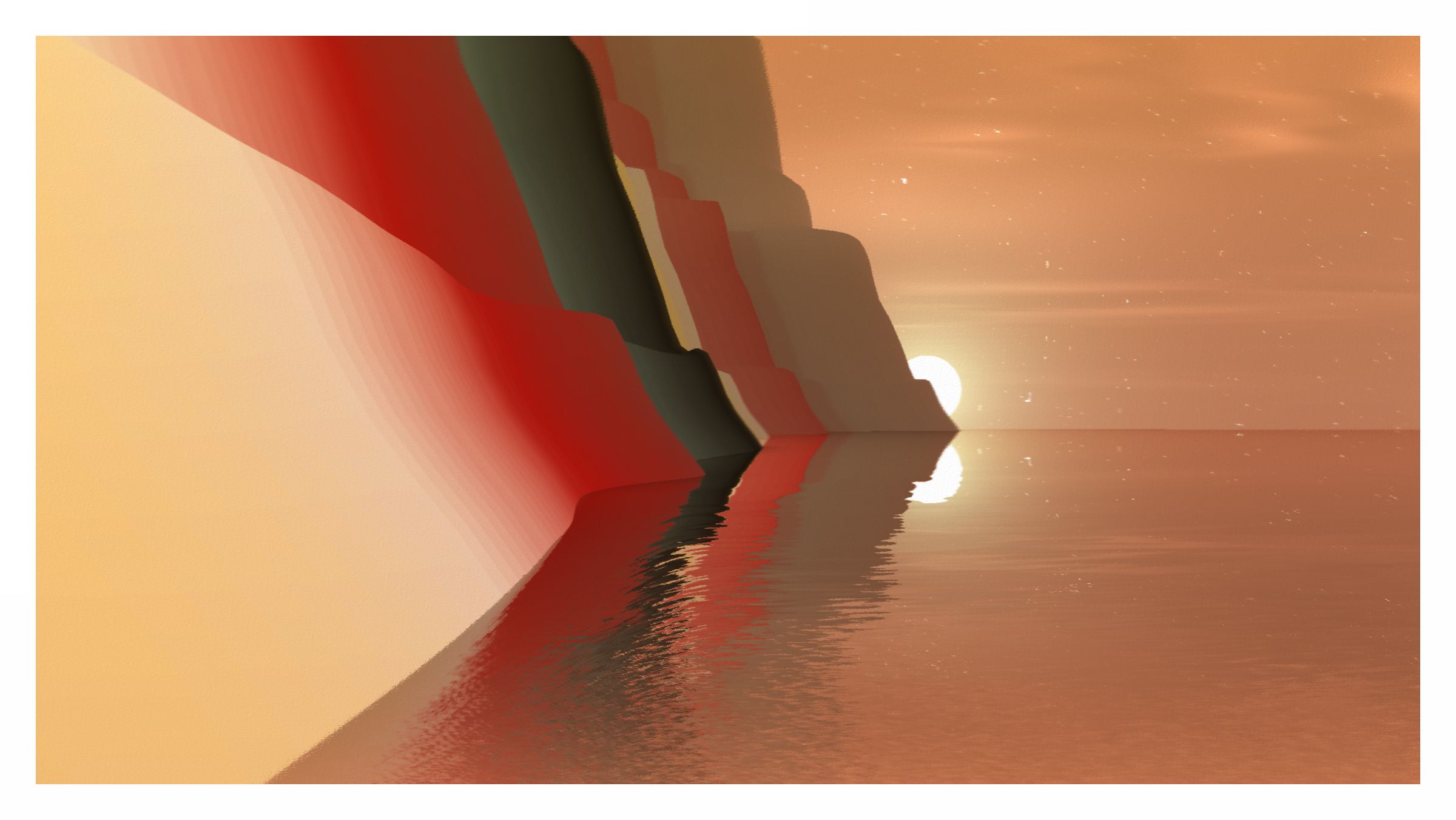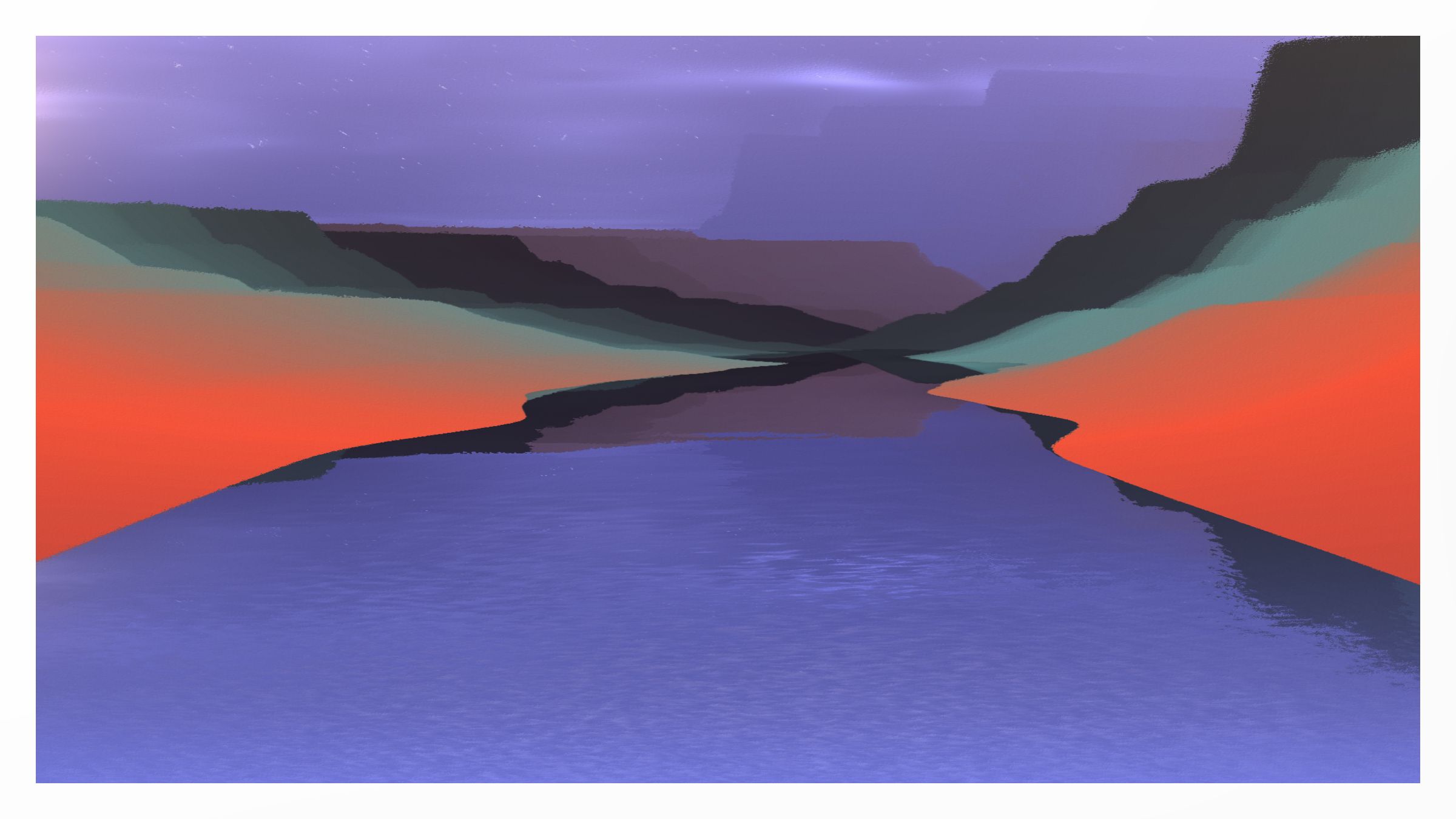 Evolving~ Movement: Time lapse after draw starting at the featured time and transitioning to the local time of the work, when local time is settled the work will display the current time and evolve the sky with it. Accompanied with the slow movement of colors ramps in the landscape, and water rippling.