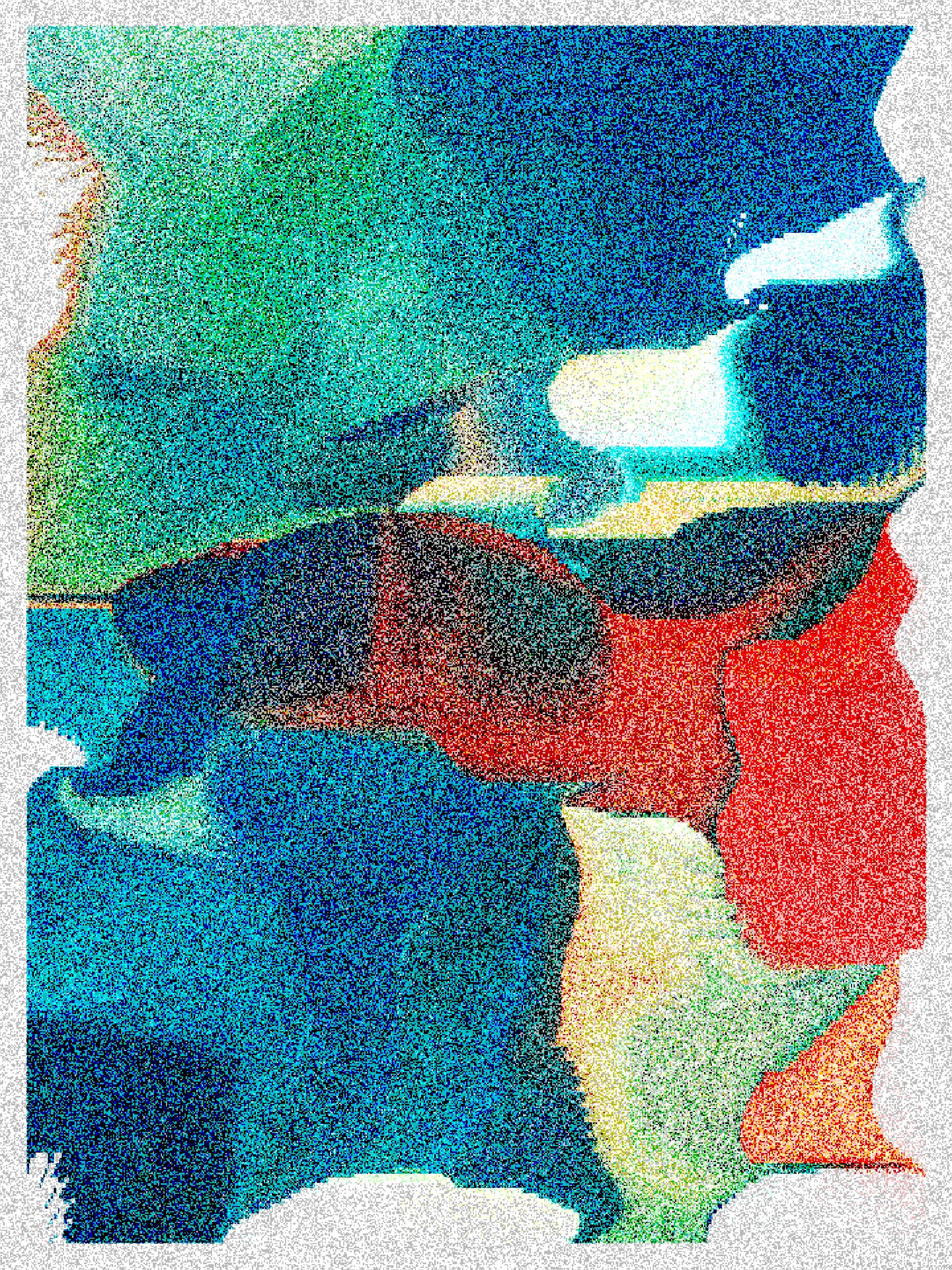 Rasterized procedural brush strokes with low transparency slowly layer themselves over each other in a rhythmic loop until they achieve colorful equilibrium. They continue to overpaint themselves endlessly. The resulting color mixtures are then quantized and dithered to separate them into patches of pixels that recall the discrete materiality of the screen: a strictly digital variation on color field painting. The resulting texture is not a skeuomorphic grain but an overt reference to the universe of screens that surround us every day. Electric light arranged in a grid, fluttering and flickering everywhere all the time.