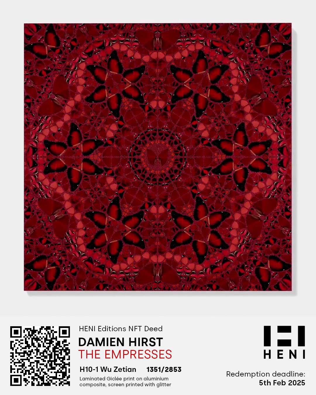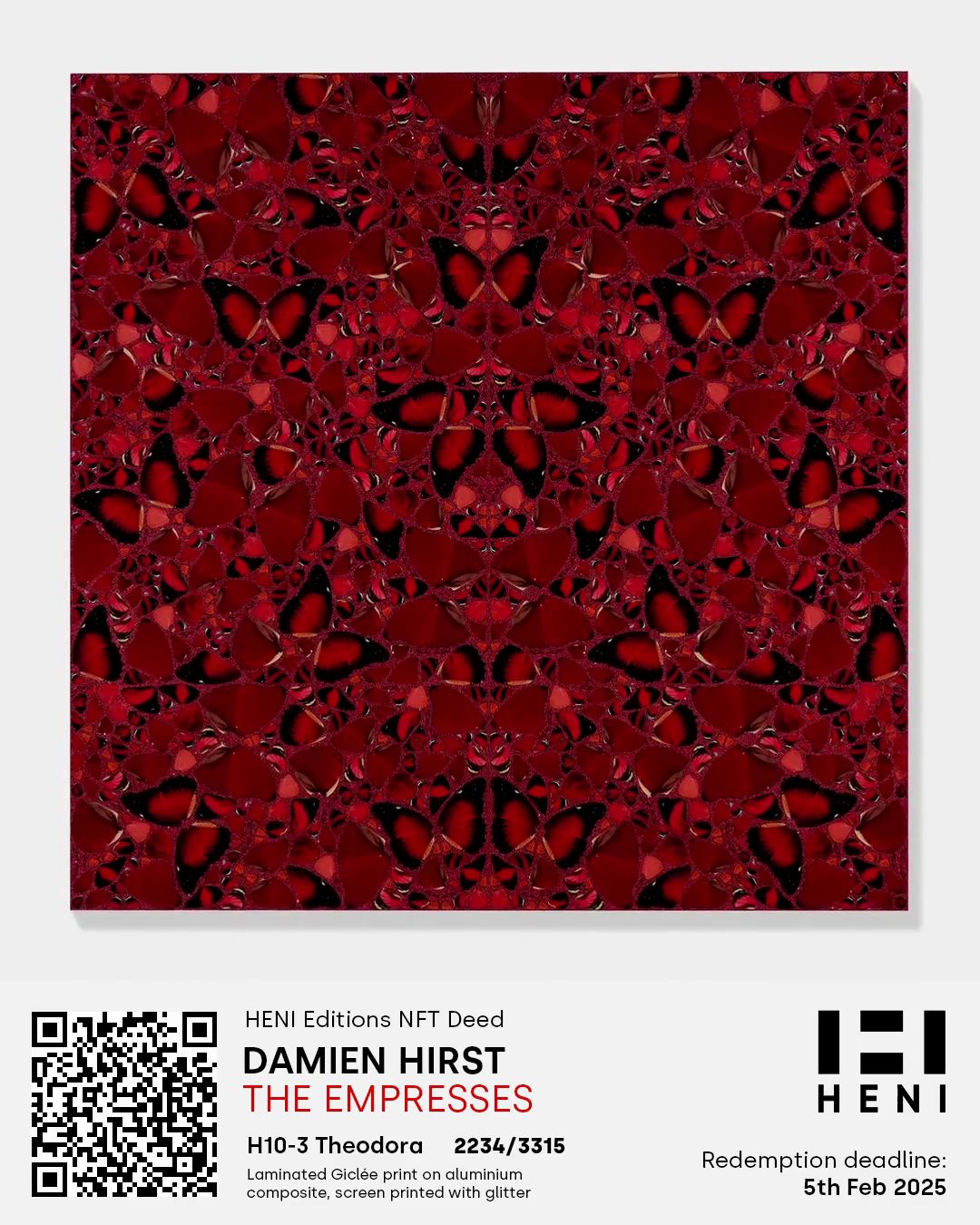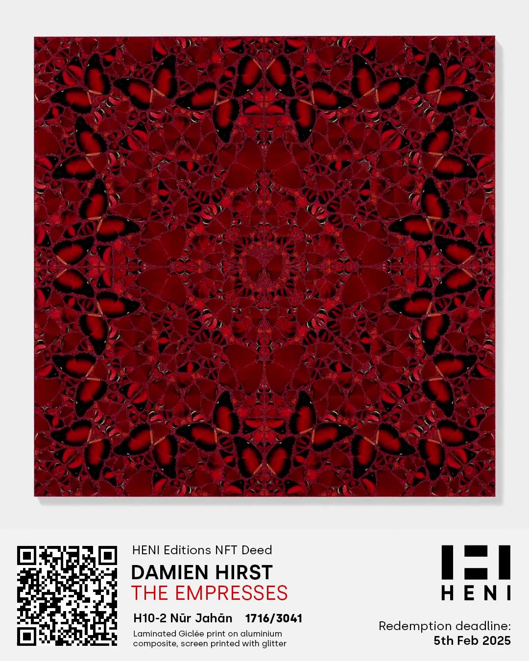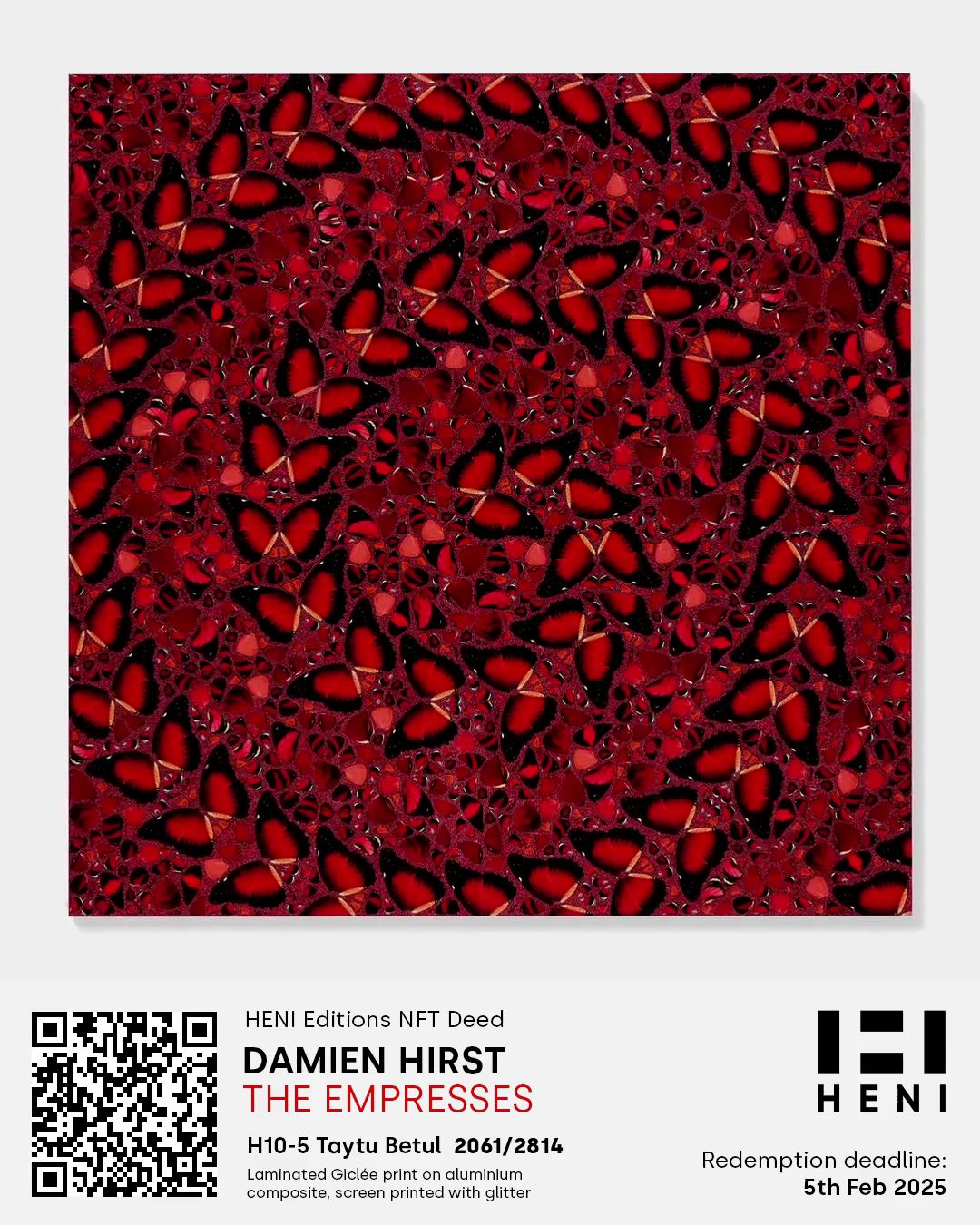 The Empresses by Damien Hirst is a series of five glorious prints depicting carefully composed images of butterflies, published by HENI Editions. This HENI Editions NFT Deed allows you to delay receipt of the physical print until up to 5th February 2025. Redemption of the NFT Deed for the physical artwork will be possible from around August 2022. For more information, please see empresses.nft.heni.com.